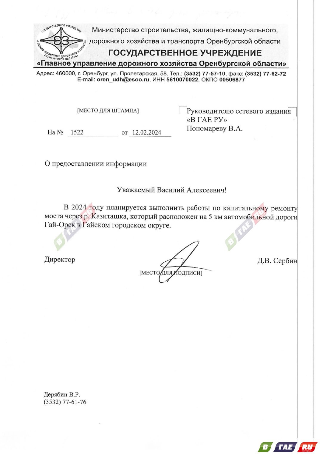 Главное управление дорожного хозяйства Оренбургской области проинформировало, что в 2024 году планируется выполнить работы по капитальному ремонту моста через р. Кизиташка. Мост расположен на 5 километре автомобильной дороги Гай - Орск в Гайском городском округе.