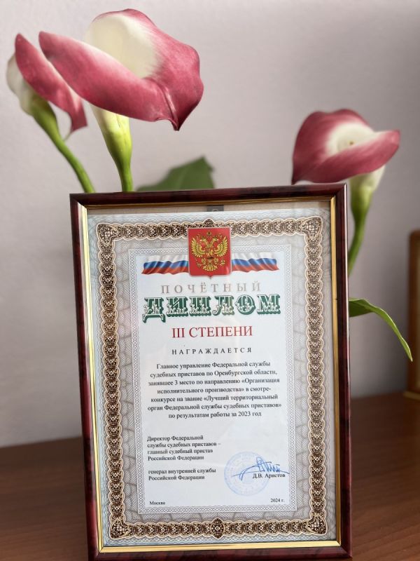 В ходе итоговой коллегии директор Федеральной службы судебных приставов Дмитрий Аристов лично поздравил главного судебного пристава Оренбургской области Руслана Шерстнёва и вручил ему почетный диплом III степени.