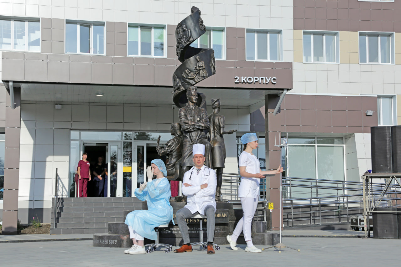 На благоустроенной территории нового корпуса губернатор Денис Паслер торжественно открыл памятник медицинским работникам Оренбургской области. Монумент представляет собой трёхфигурную композицию, объединённую двойной спиралью ДНК с историческими сюжетами, профессиональными терминами и тематическими высказываниями на латинском языке. Авторы памятника — творческий коллектив под руководством скульптора Александра Сукманова. В постаменте заложена капсула времени с посланием для будущих поколений медиков.