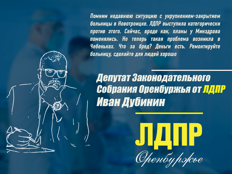 Постоянное реформирование медицины - больная тема для Оренбуржья. Депутат Законодательного Собрания Оренбургской области от ЛДПР Иван Дубинин отмечает, что иногда очередные шаги по "модернизации медицины выглядят, как намеренная попытка нанести вред гражданам: "К депутатам ЛДПР регулярно обращаются люди по поводу бардака, происходящего в медицине. Мы помним недавнюю ситуацию с укрупнением-закрытием больницы в Новотроицке. ЛДПР выступила категорически против этого. Сейчас, вроде как, планы у Минздрава поменялись. Но теперь такая проблема возникла в Чебеньках. Что за бред? Деньги есть. Ремонтируйте больницу, сделайте для людей хорошо".